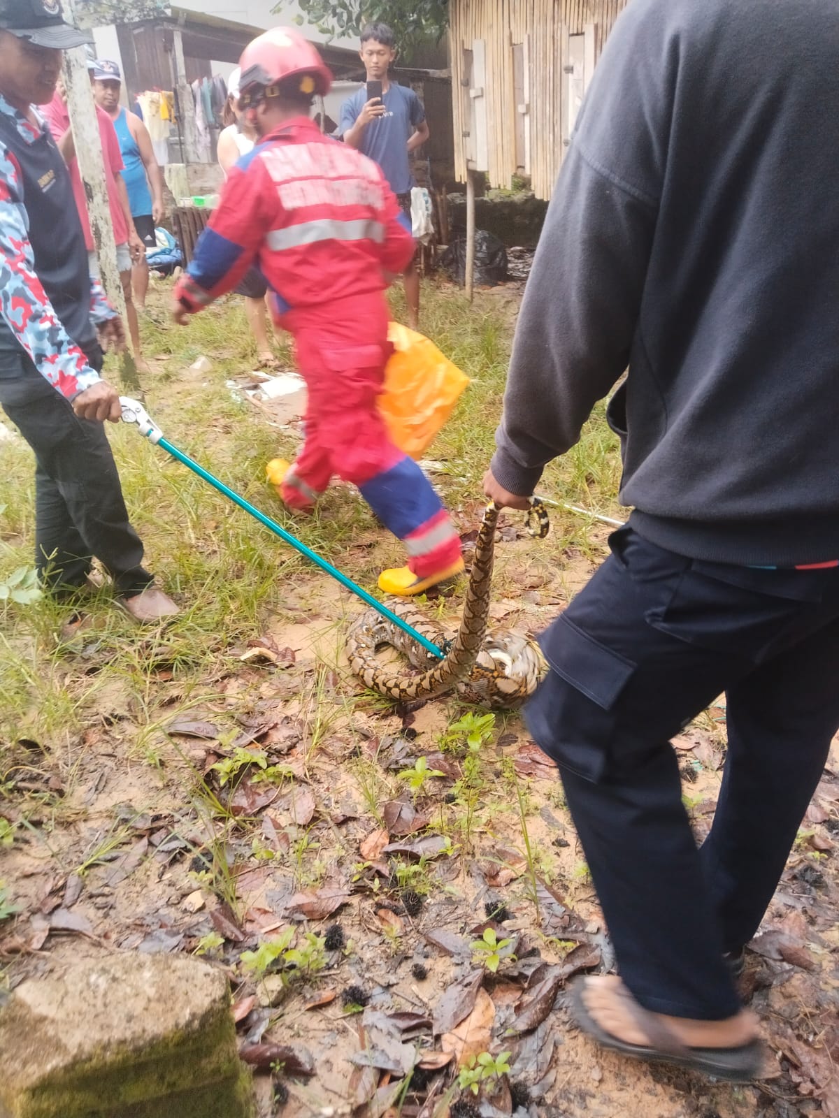 Marangkayu – Dinas Pemadam Kebakaran dan Penyelamatan Kabupaten Kutai Kartanegara melalui Pos Kecamatan Marangkayu melaksanakan kegiatan penanganan dan evakuasi seekor ular sawa yang dilaporkan masuk ke lingkungan permukiman warga di Desa Sebuntal, Kecamatan Marangkayu, Sabtu (07/03/2026).