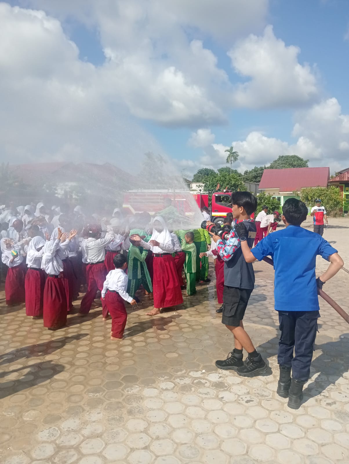Kegiatan berlangsung sejak pukul 08.00 hingga 09.40 WITA, diikuti dengan penuh semangat oleh para siswa dan guru. Aksi penyiraman ini menjadi momen penuh keceriaan yang menambah semarak peringatan Hari Sumpah Pemuda di lingkungan sekolah. Para siswa tampak antusias saat disemprotkan air dari unit mobil pemadam kebakaran, menciptakan suasana meriah dan kebersamaan.